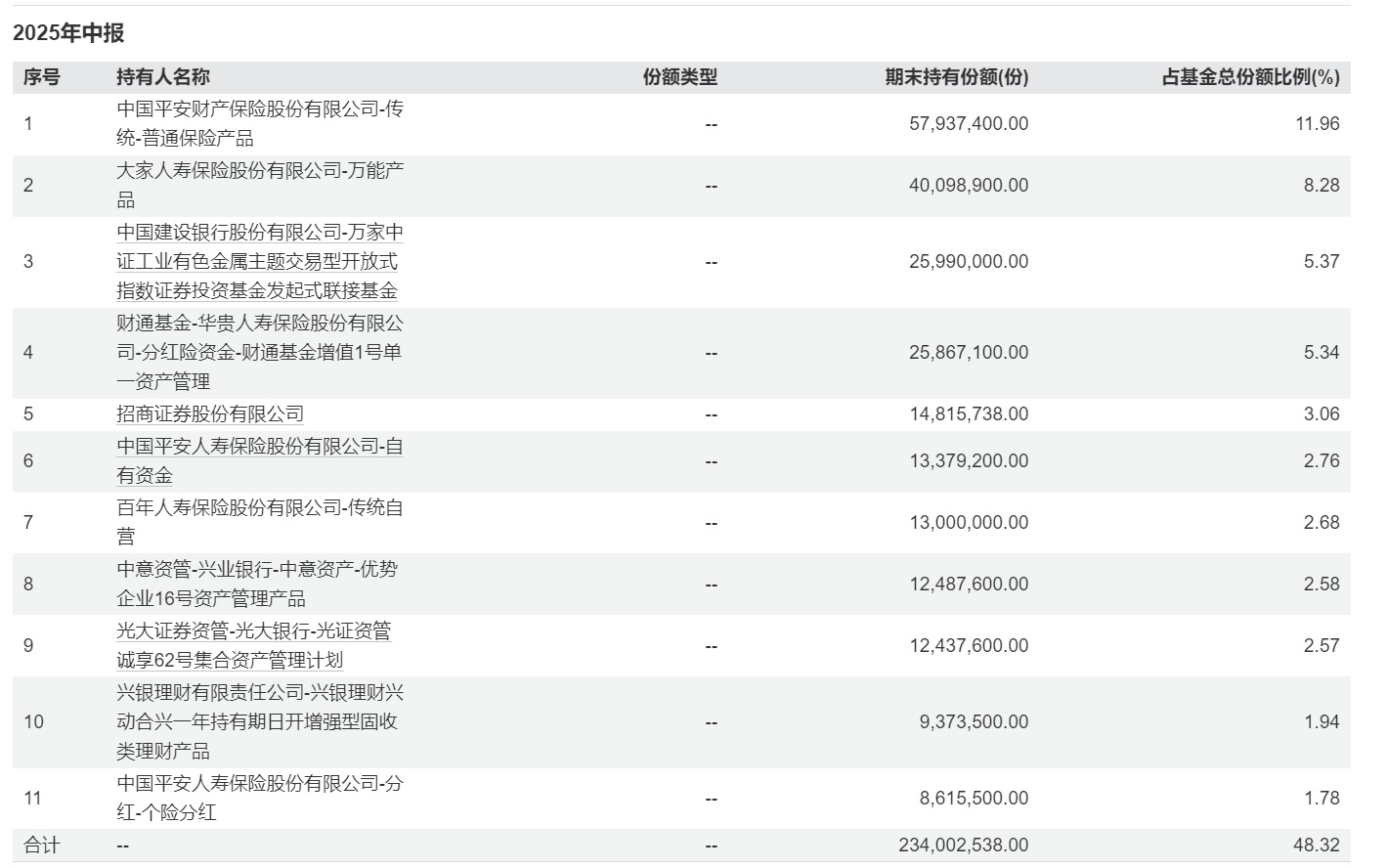 工业有色具备赛道高景气度和业绩高持续性,引发机构长钱纷纷加注工业有色ETF万家(560860)。2025年中报最新数据显示,该ETF机构投资者从2024年末的41%升至近60%,只隔了半年时间;前十大持有人合计占比超48%,其中6位都是险资机构,包含普通保险、万能险、分红险及险资自有资金,彰显险资长钱对工业有色金属板块在经济复苏周期景气度回升的持续看好,此外还有券商、资管、银行理财子公司等机构。